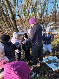 * Spurensuche (Hase -, Reh-, Wildschwein- und Hundespuren haben wir gefunden)* einen Fuchsbau entdeckt* am vereisten Weg sind wir gerutscht* den Unterschied zw. Nadel- und Laubbäumen haben wir festgestellt.“