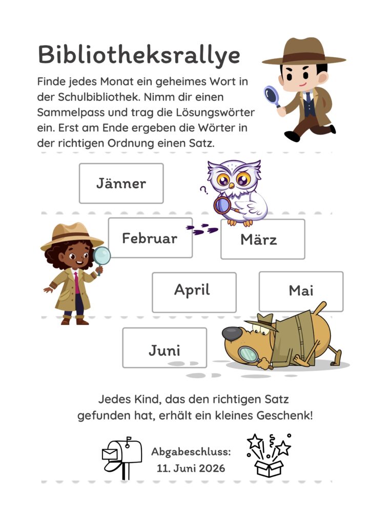 Jedes Monat bis zum Schulschluss wird es zwischen unseren 3000 Büchern ein neues geheimes Wort zu entdecken geben. Hol dir am Donnerstag einen Sammelpass in der Bibliothek!