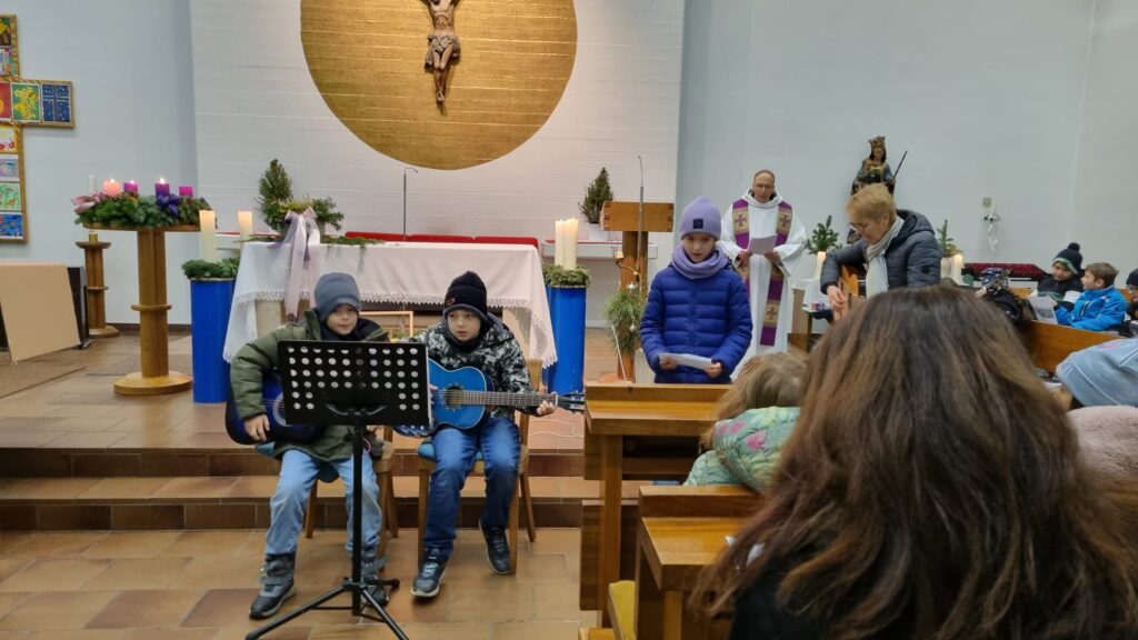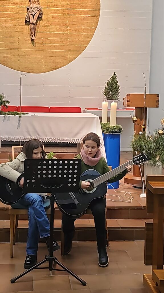 In der voll besetzten Kirche wirkten außerdem Aaron, David, Sophia, Robin, Katharina und Lara mit ihren Instrumenten bei einem fröhlichen Weihnachtslied mit.