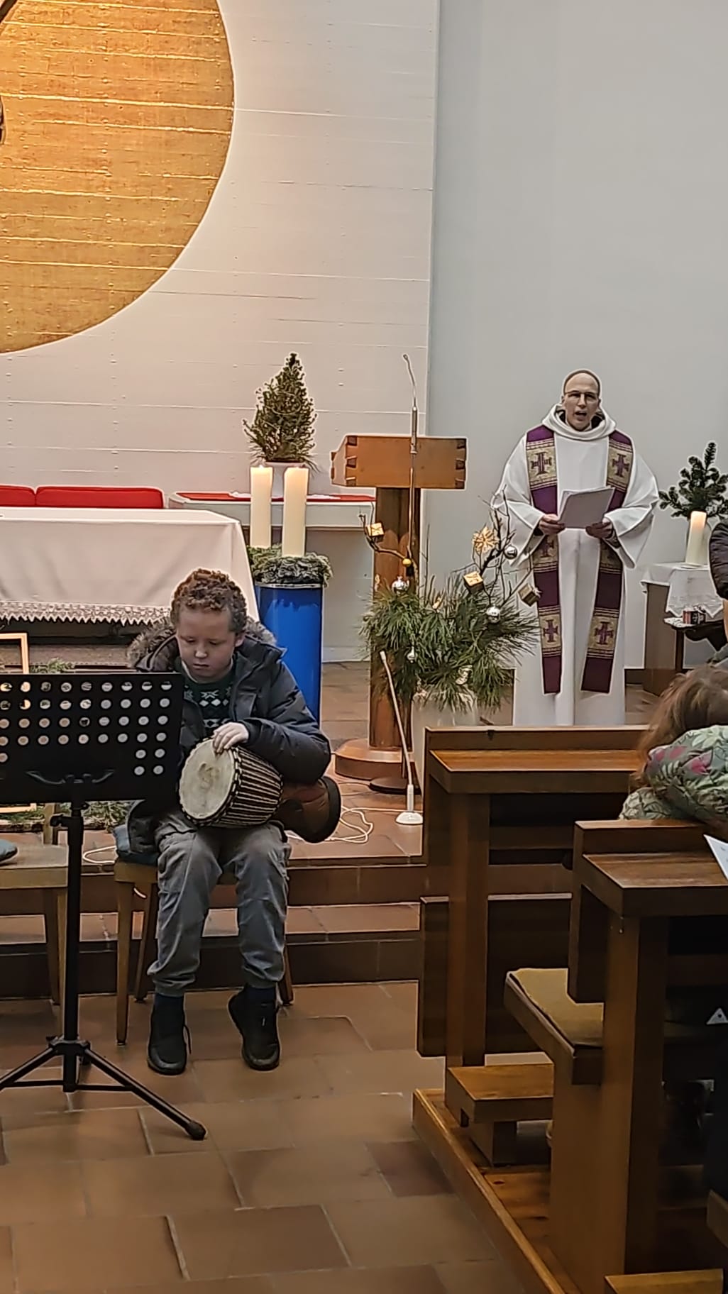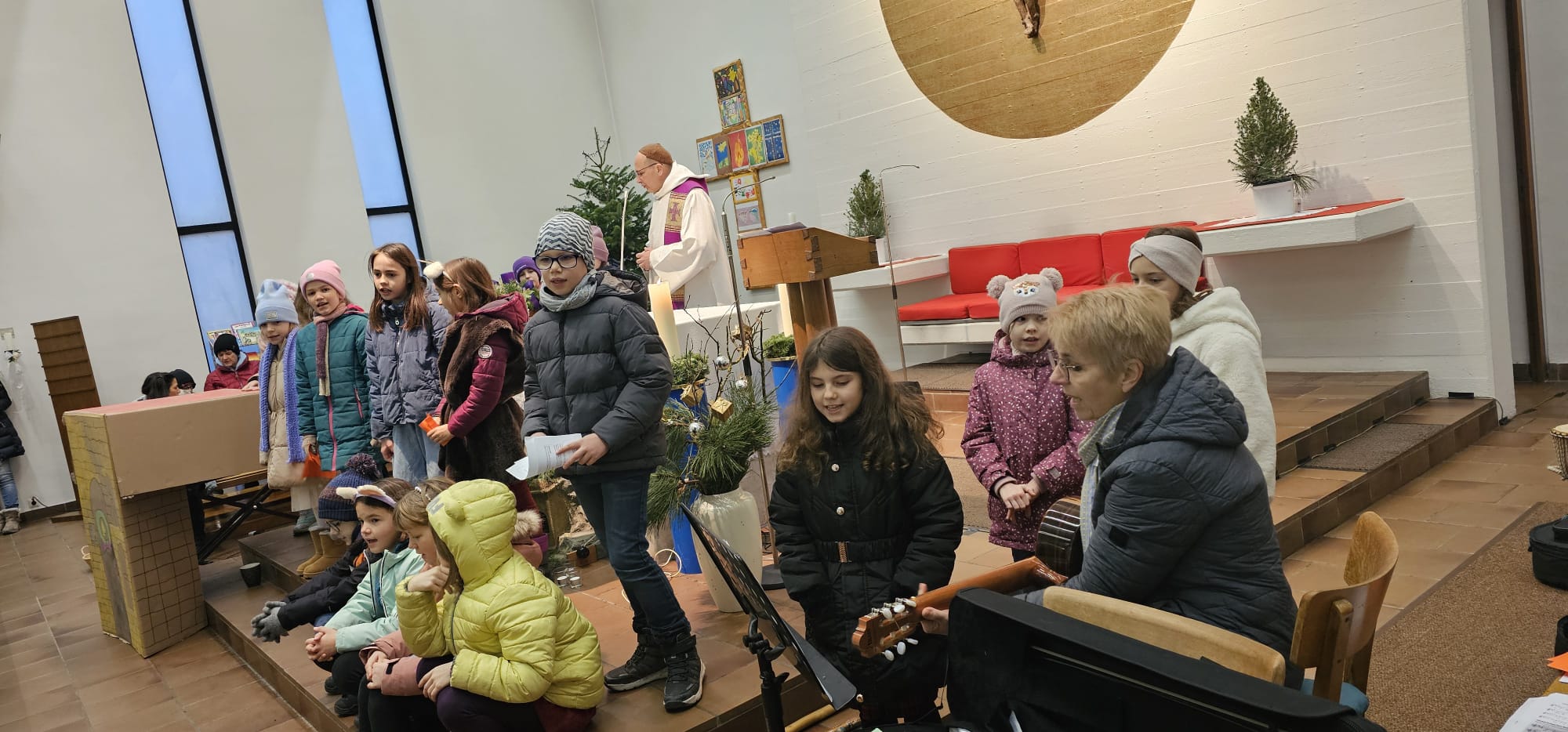 In der voll besetzten Kirche wirkten außerdem Aaron, David, Sophia, Robin, Katharina und Lara mit ihren Instrumenten bei einem fröhlichen Weihnachtslied mit.