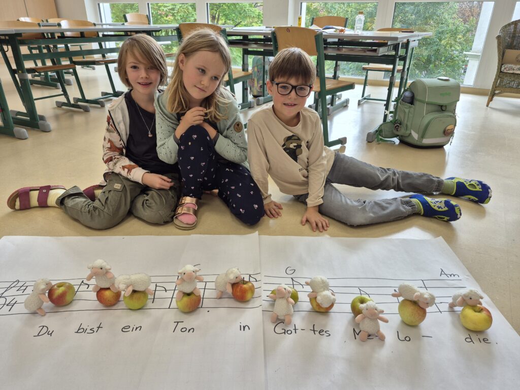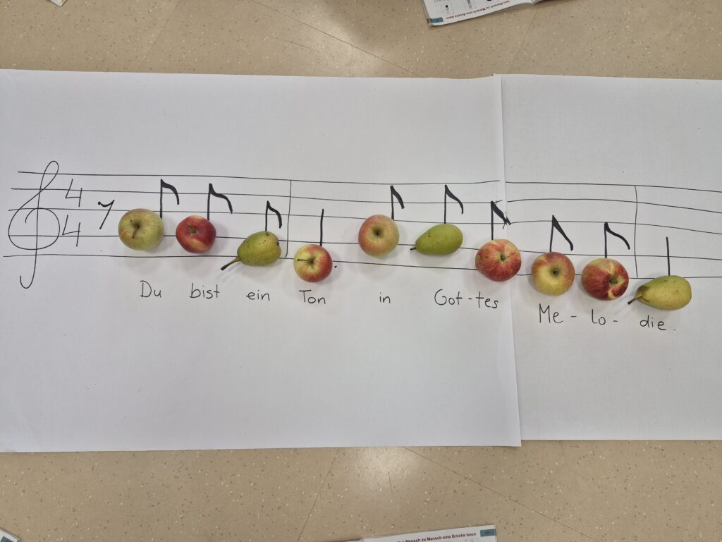 Mit Äpfeln und Birnen (die man ja sonst nicht mischen soll 😉) legten die Kinder ganz genau die Noten der ersten Zeile des Liedes.